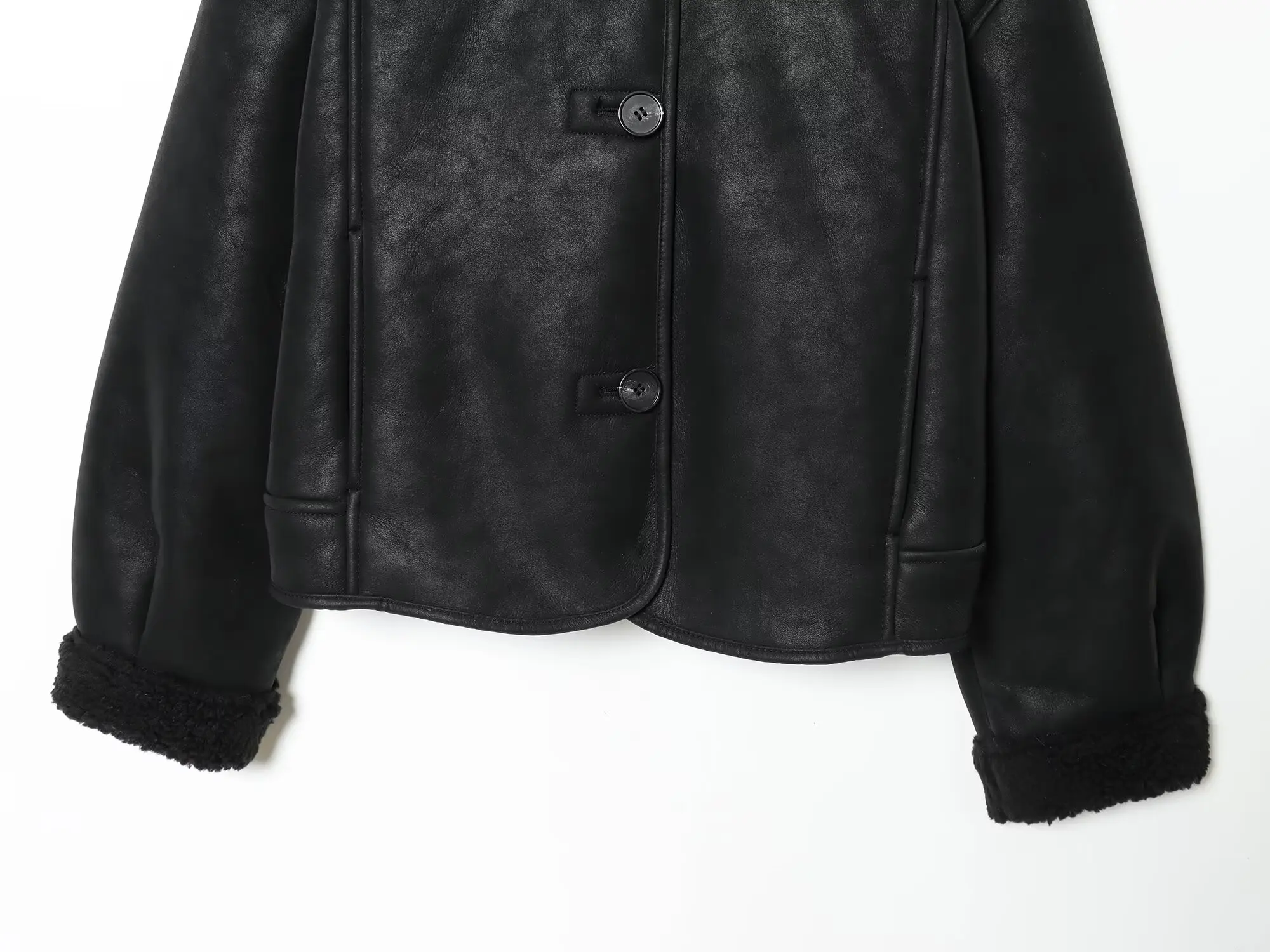 2025 new women's long sleeved suede effect double-sided jacket women's leather jacket button casual short jacket autumn new fash