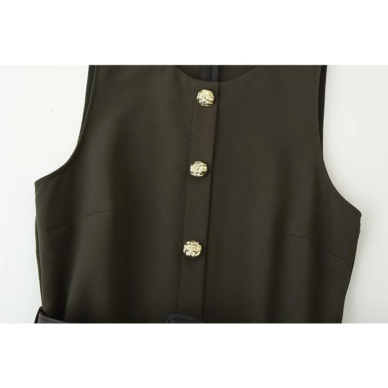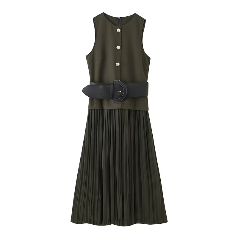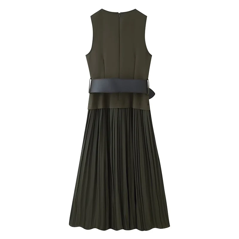 Chic Fashion Splicing Autumn Dress Pleated Long Dresses For Women 2025 With Belt Midi Dress Woman Sleeveless Casual Dresses