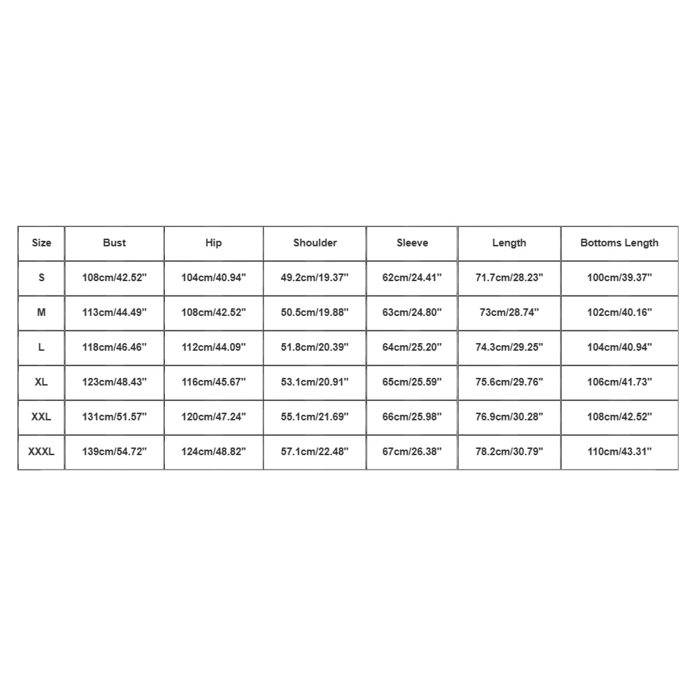 | Size:XXXL | Bust:139cm/54.72” | Hip:124cm/48.82” | Shoulder:57.1cm/22.48” | Sleeve:67cm/26.38” | Length:78.2cm/30.79” | Bottoms Length:110cm/43.31” |