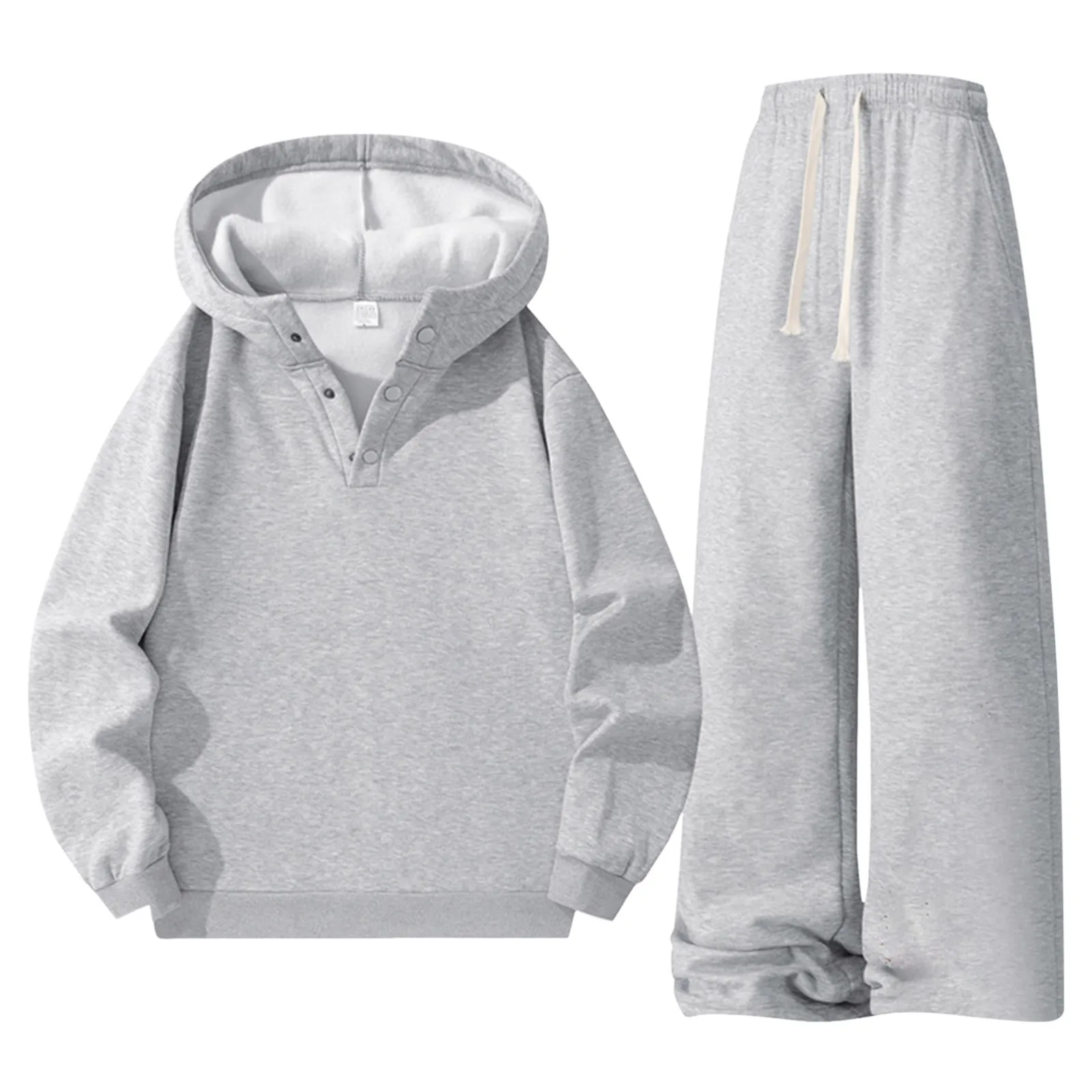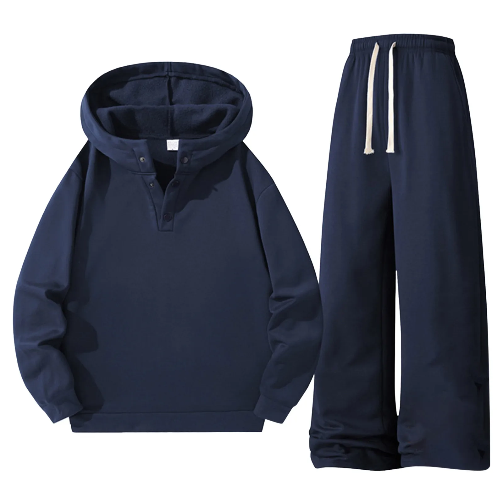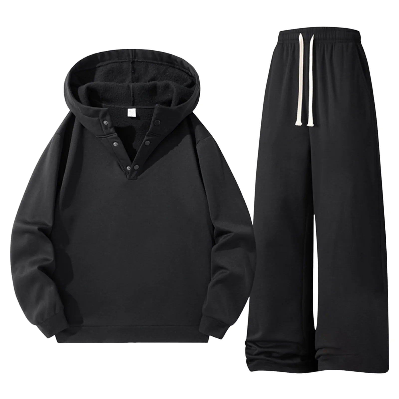 Men’s Fleece Hooded Loose Straight Leg Long Pants Solid Color Full Set Casual Two Piece Suit