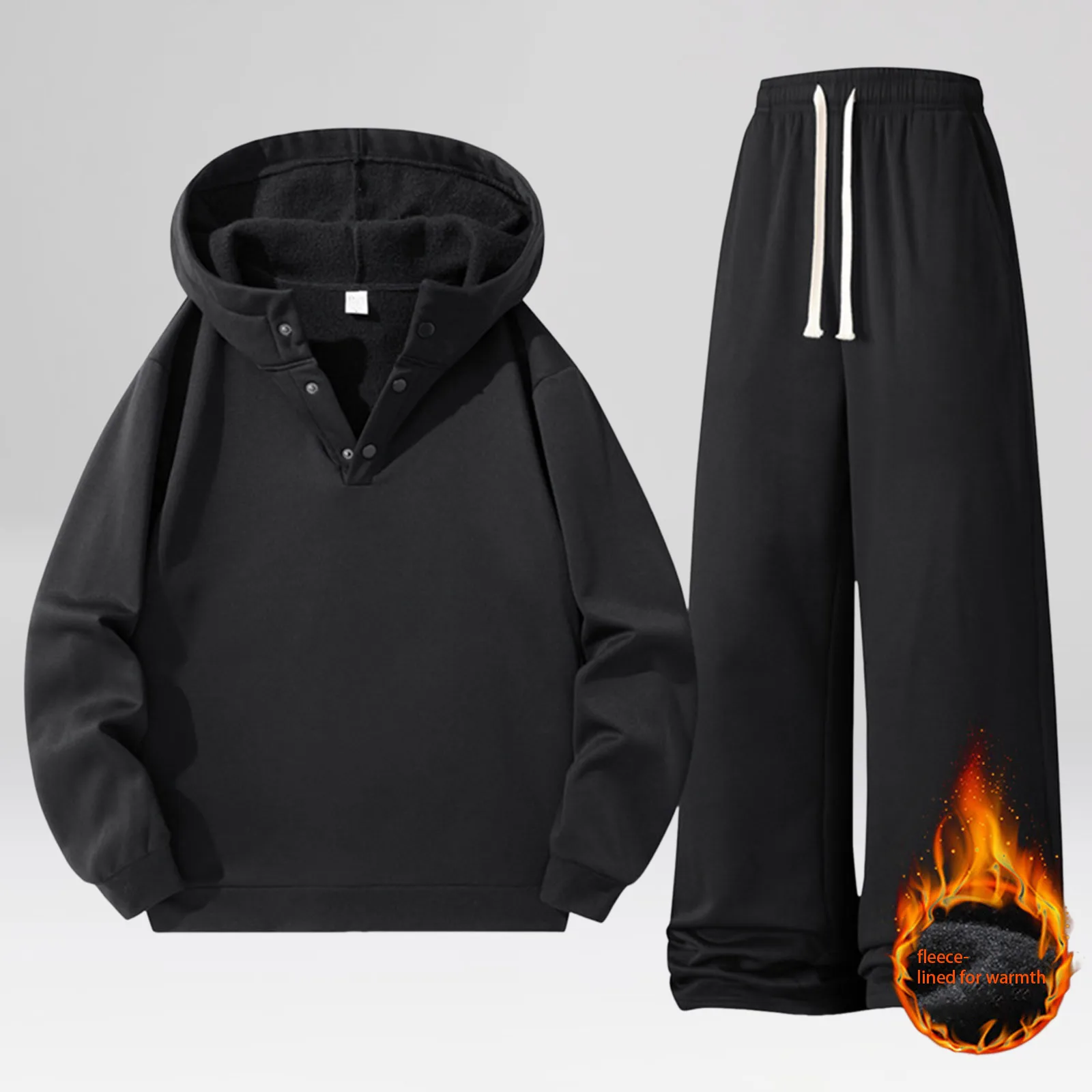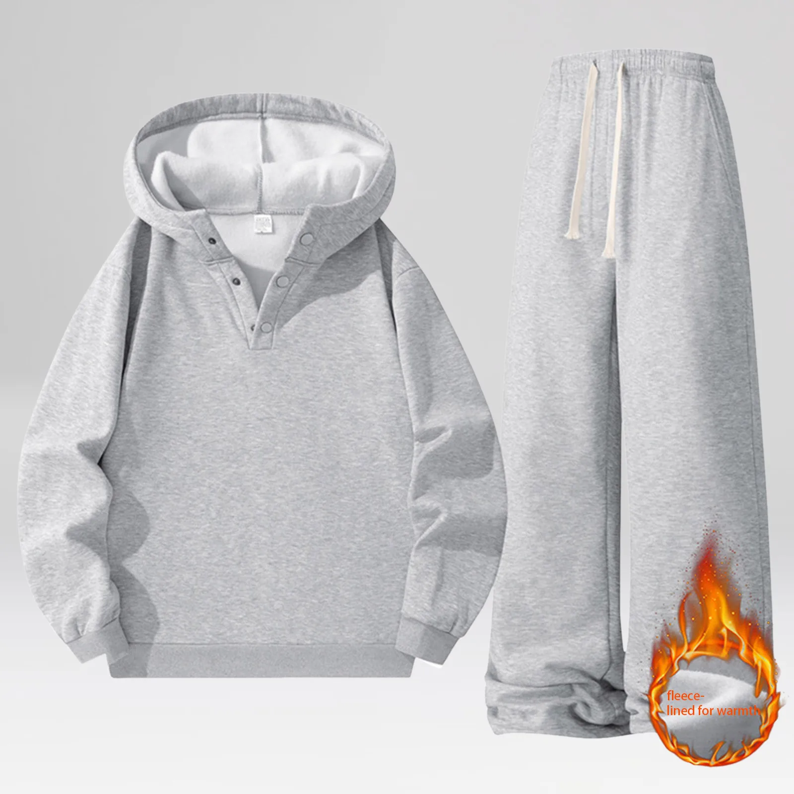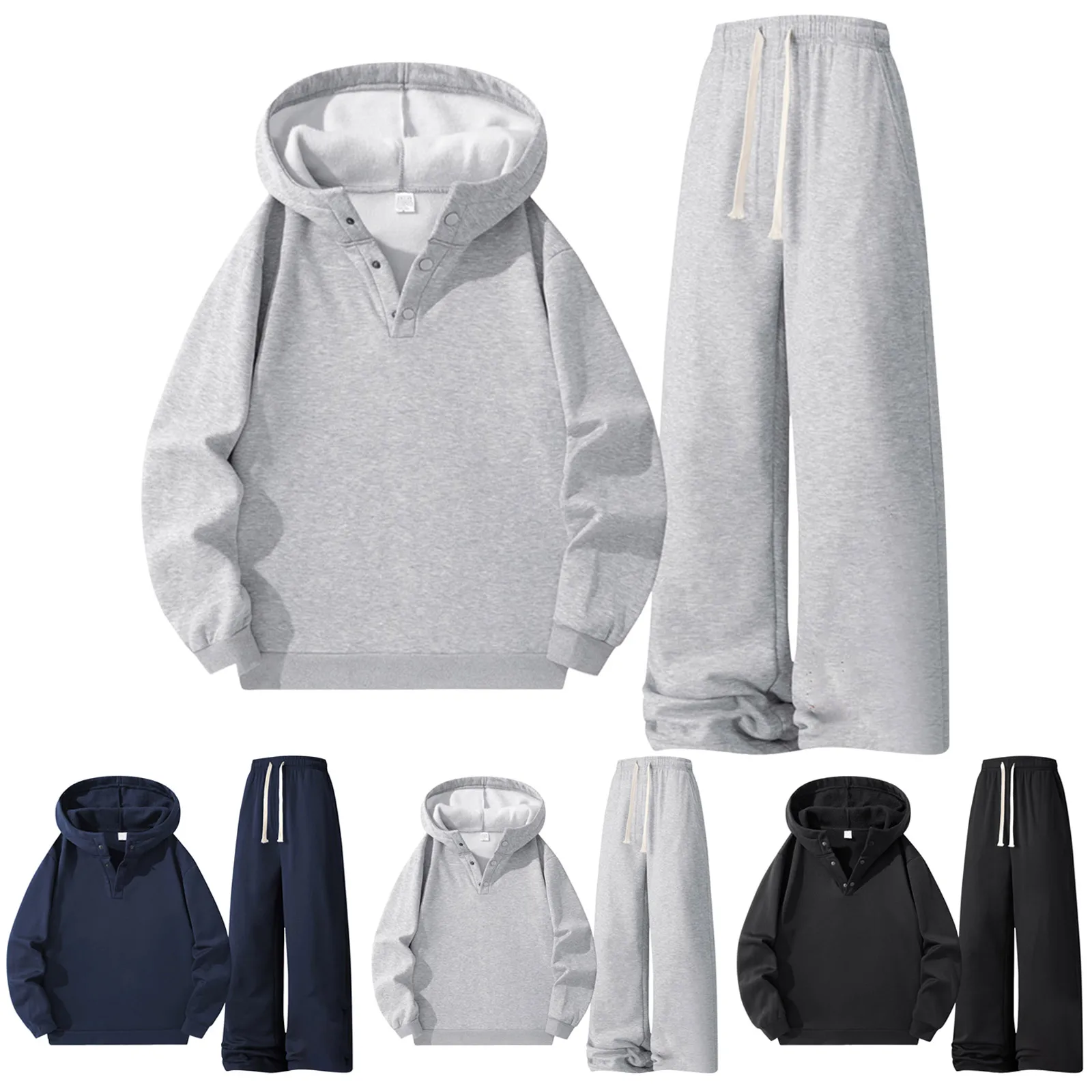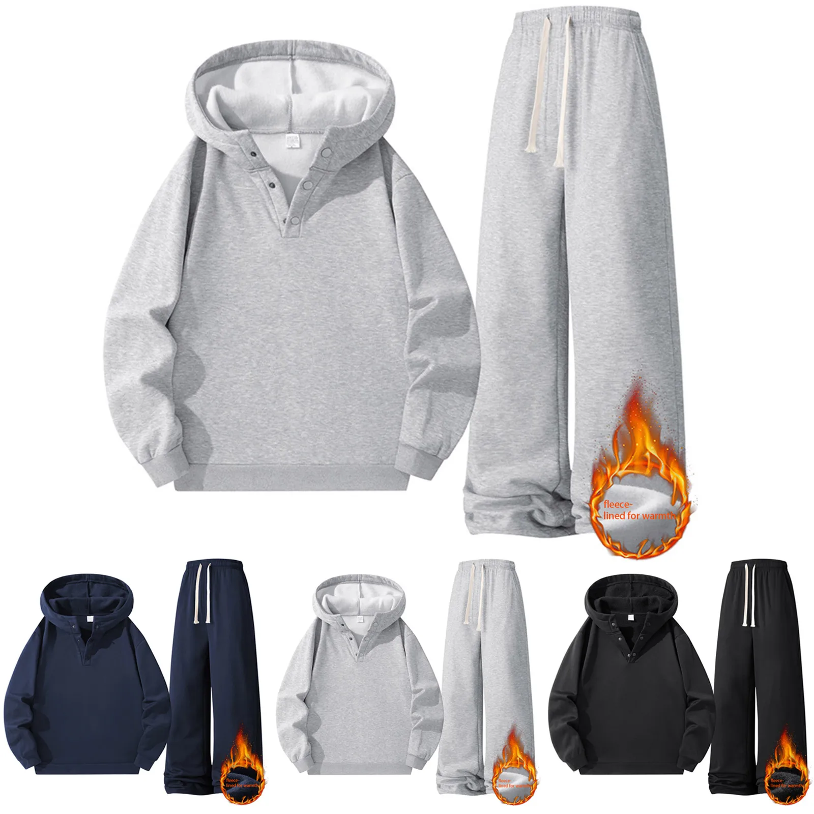 Men’s Fleece Hooded Loose Straight-Leg Long Pants Solid Color Full Set Casual Two-Piece Suit