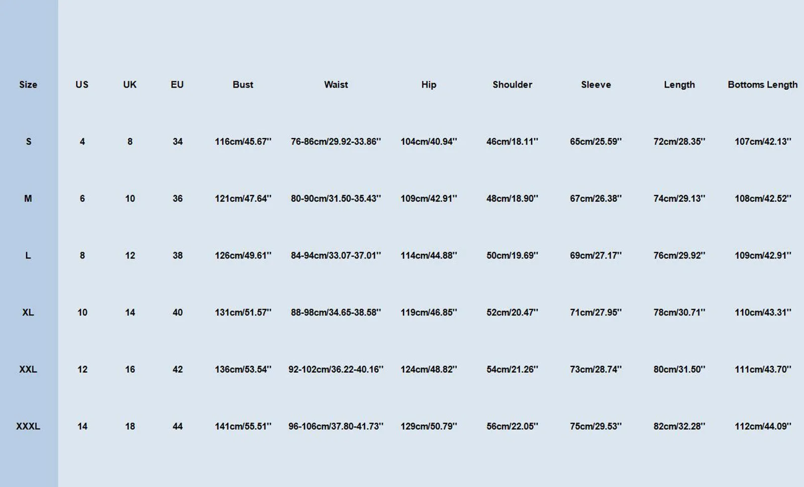 | Size:XXXL | US:14 | UK:18 | EU:44 | Bust:141cm/55.51” | Waist:96-106cm/37.80-41.73” | Hip:129cm/50.79” | Shoulder:56cm/22.05” | Sleeve:75cm/29.53” | Length:82cm/32.28” | Bottoms Length:112cm/44.09” |