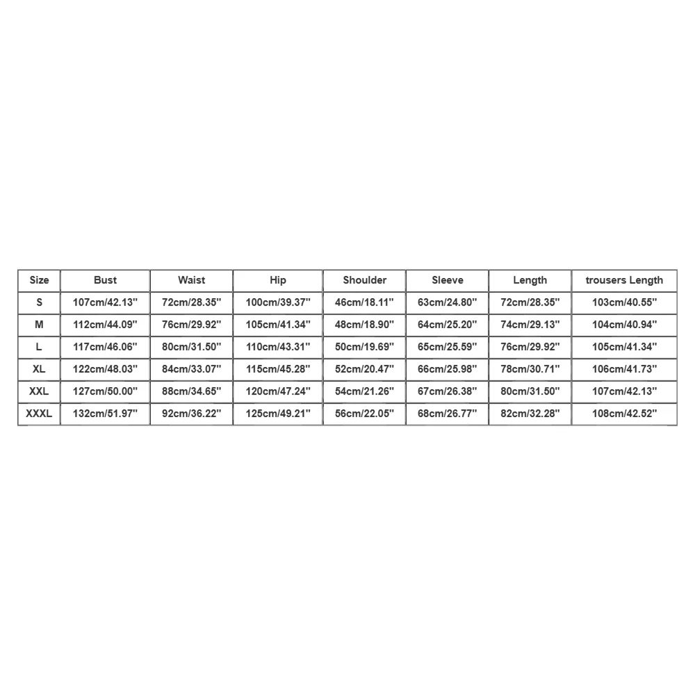| Size:XL | Bust:122cm/48.03” | Waist:84cm/33.07” | Hip:115cm/45.28” | Shoulder:52cm/20.47” | Sleeve:66cm/25.98” | Length:78cm/30.71” | trousers Length:106cm/41.73” |