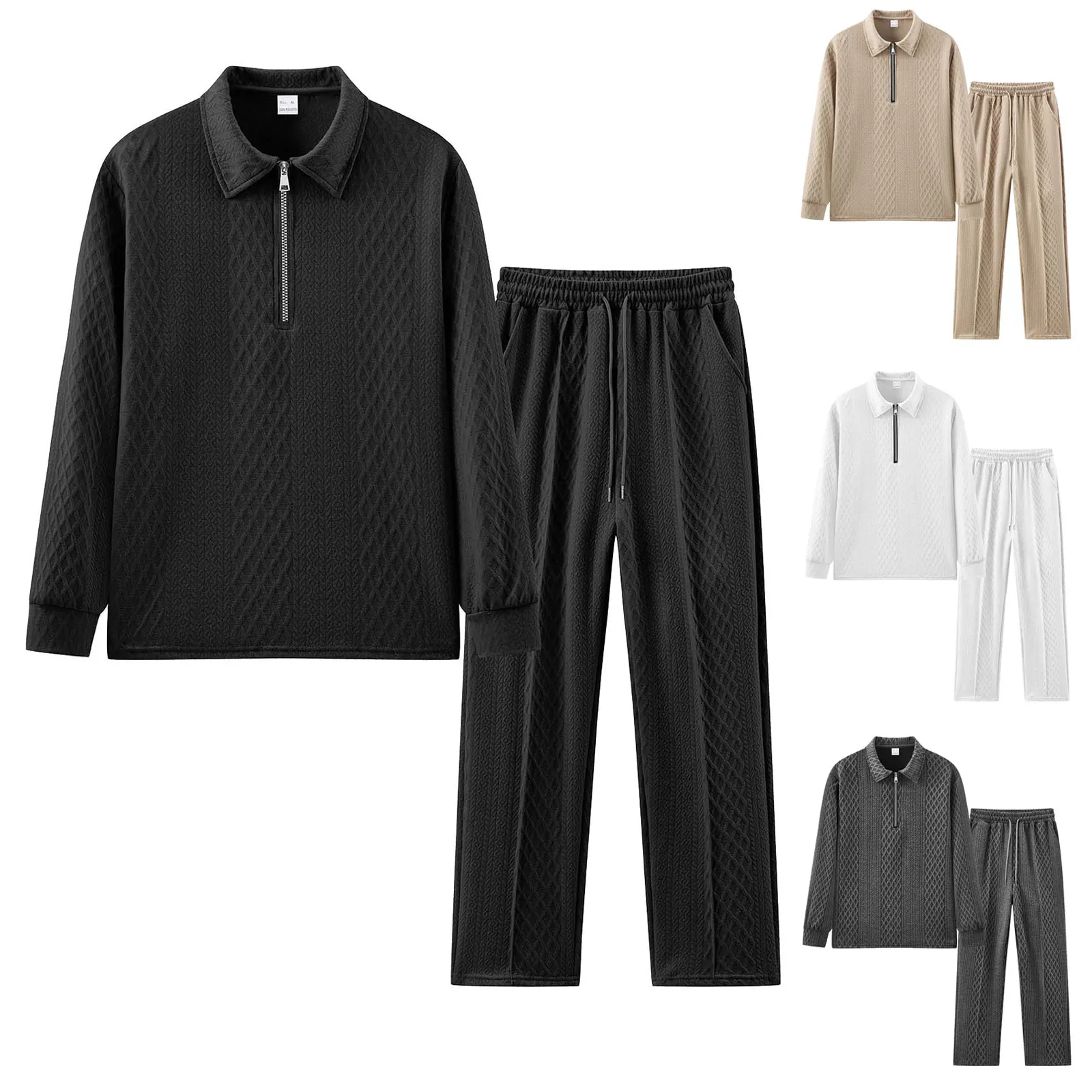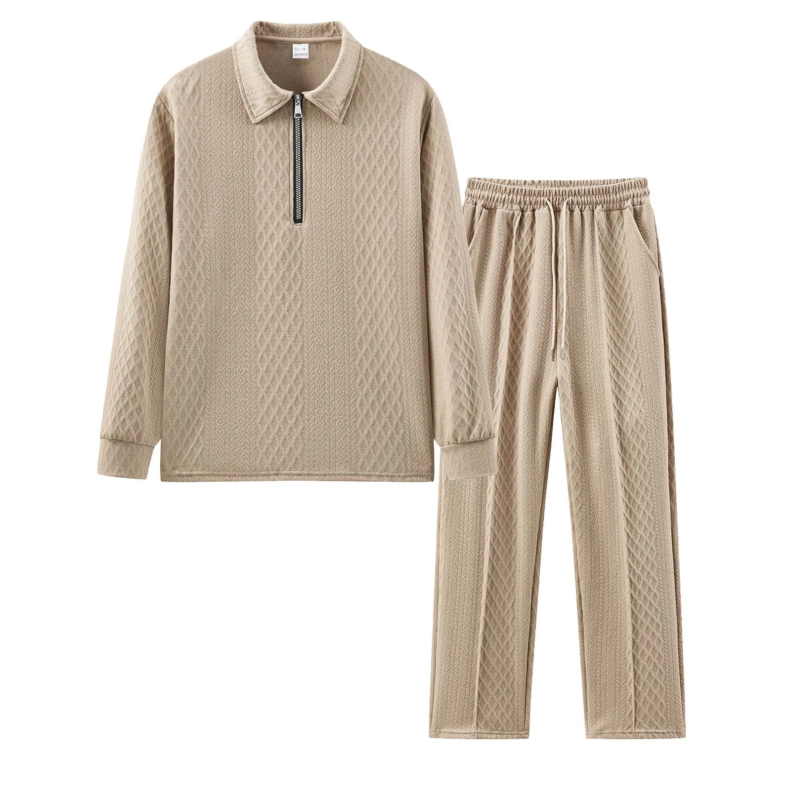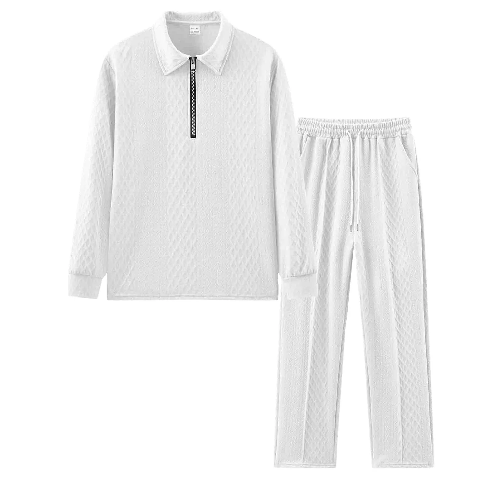 Men’S Sportswear Pants Set Solid Color Knitted Jacquard Long Sleeve Zipper Top Elastic Waist Lace Straight Trousers Casual Suit