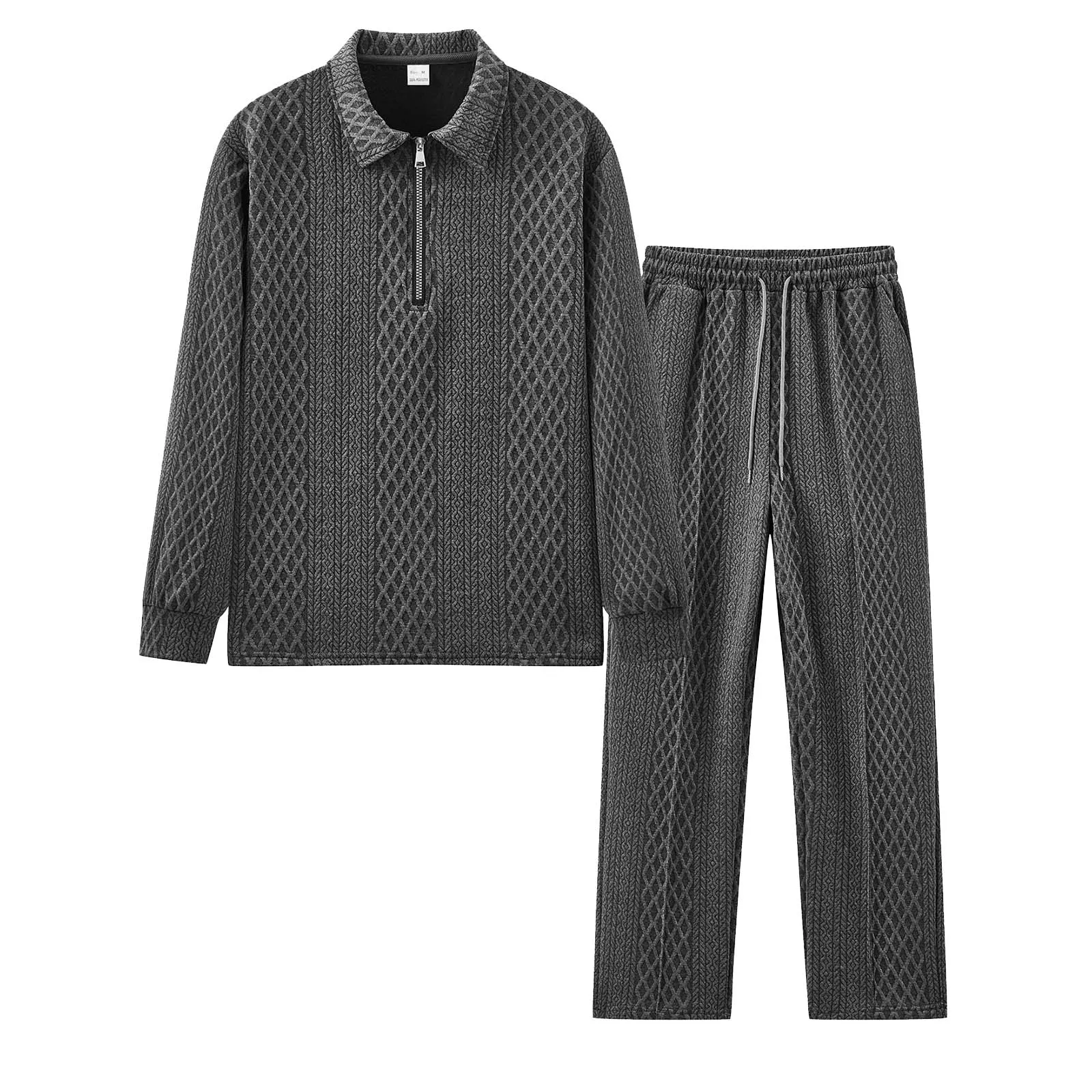 Men’s Sportswear Solid Color Knitted Jacquard Long Sleeve Semi Zipper Top Elastic Waist Lace Straight Trousers