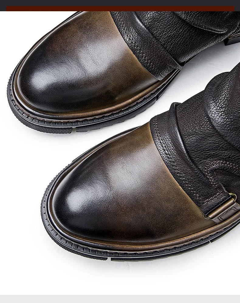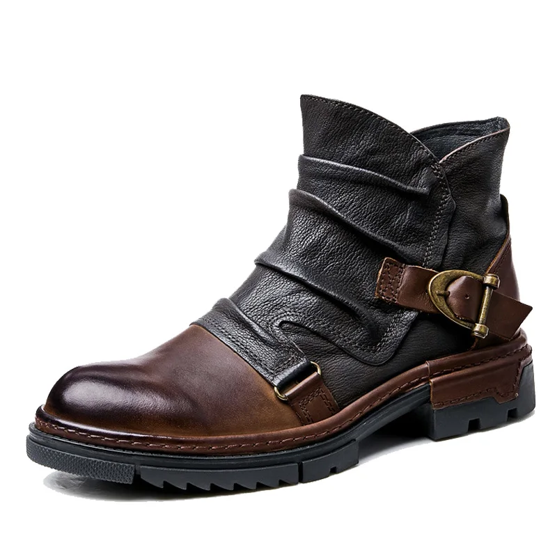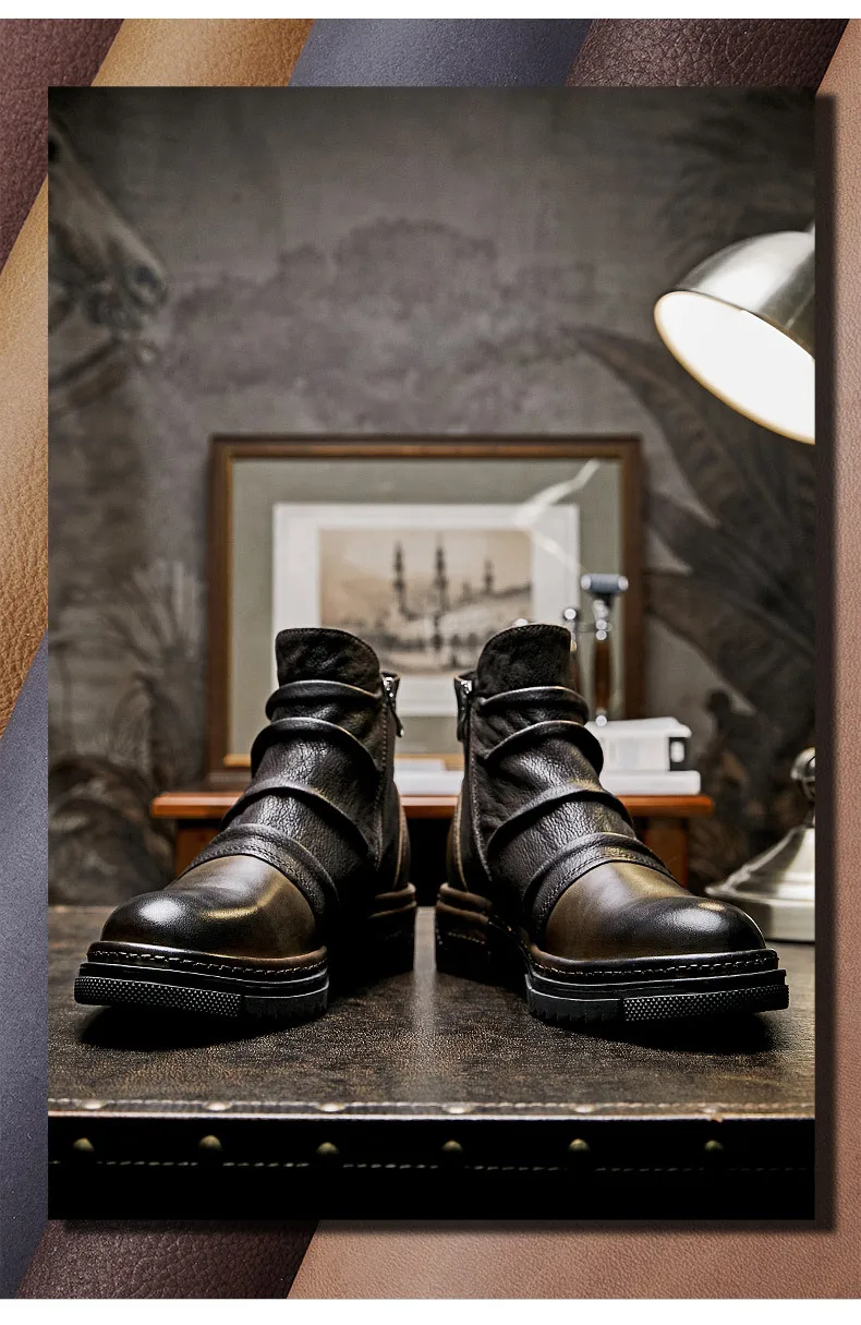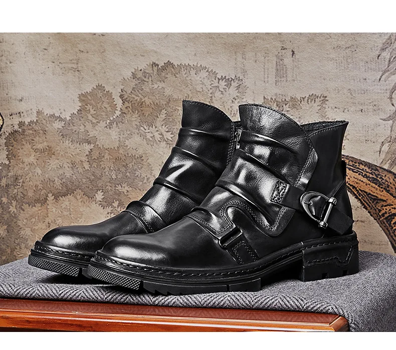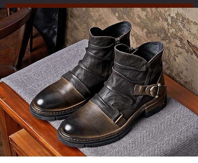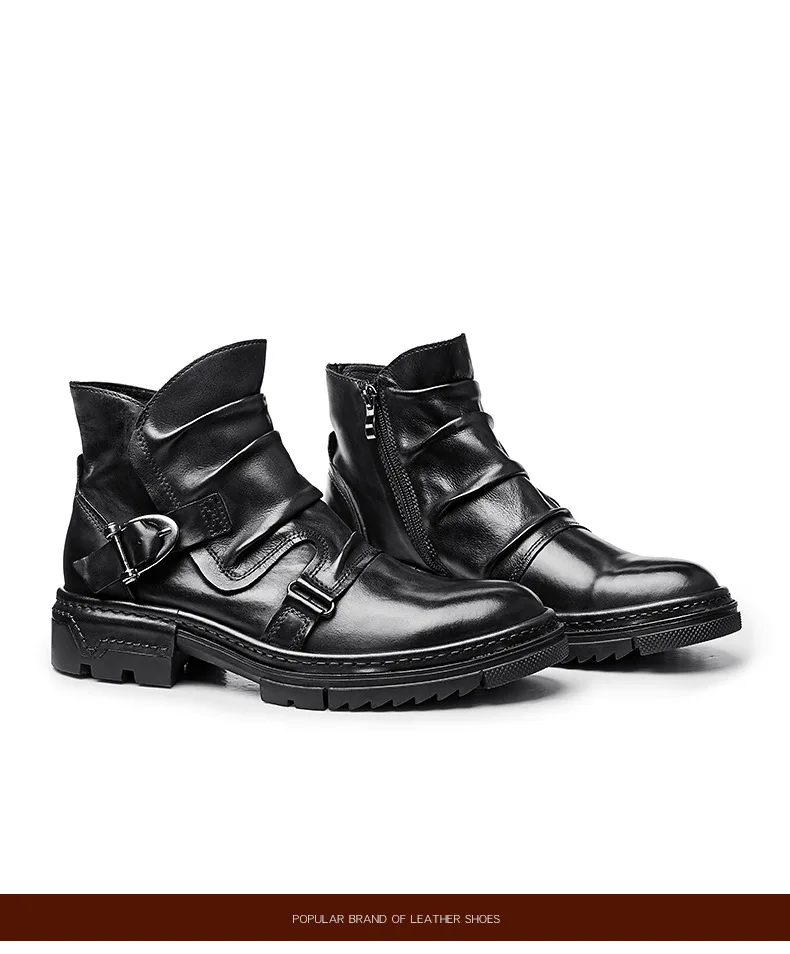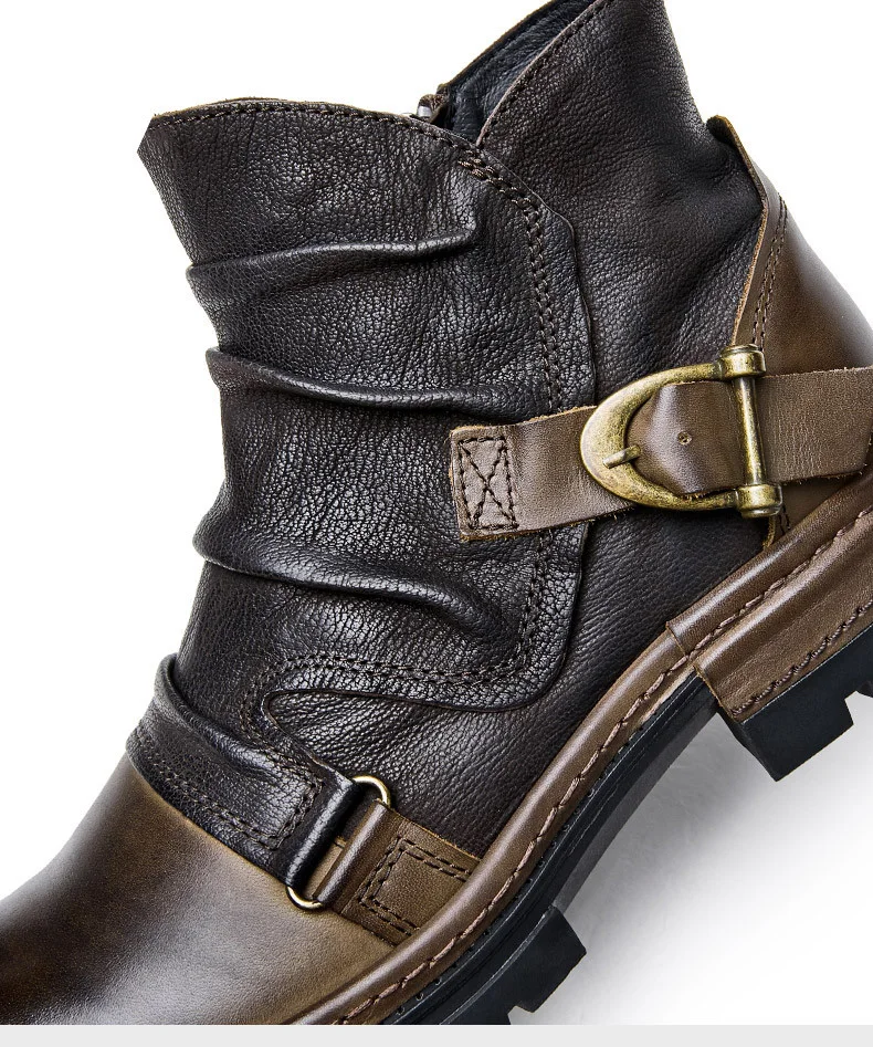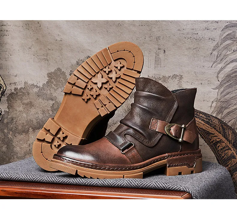 Pleated Buckle Ankle Boots Genuine Leather Retro British Handmade Motorcycle Boots Vintage Shoes