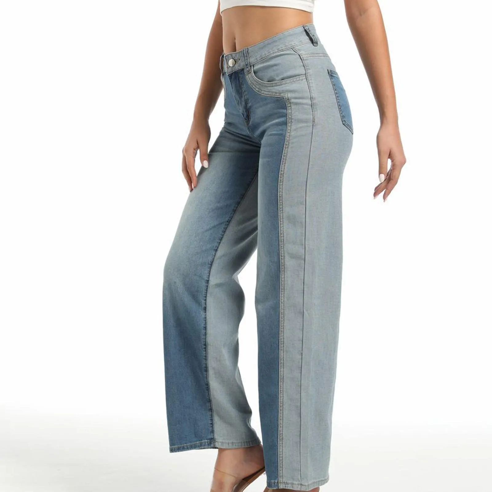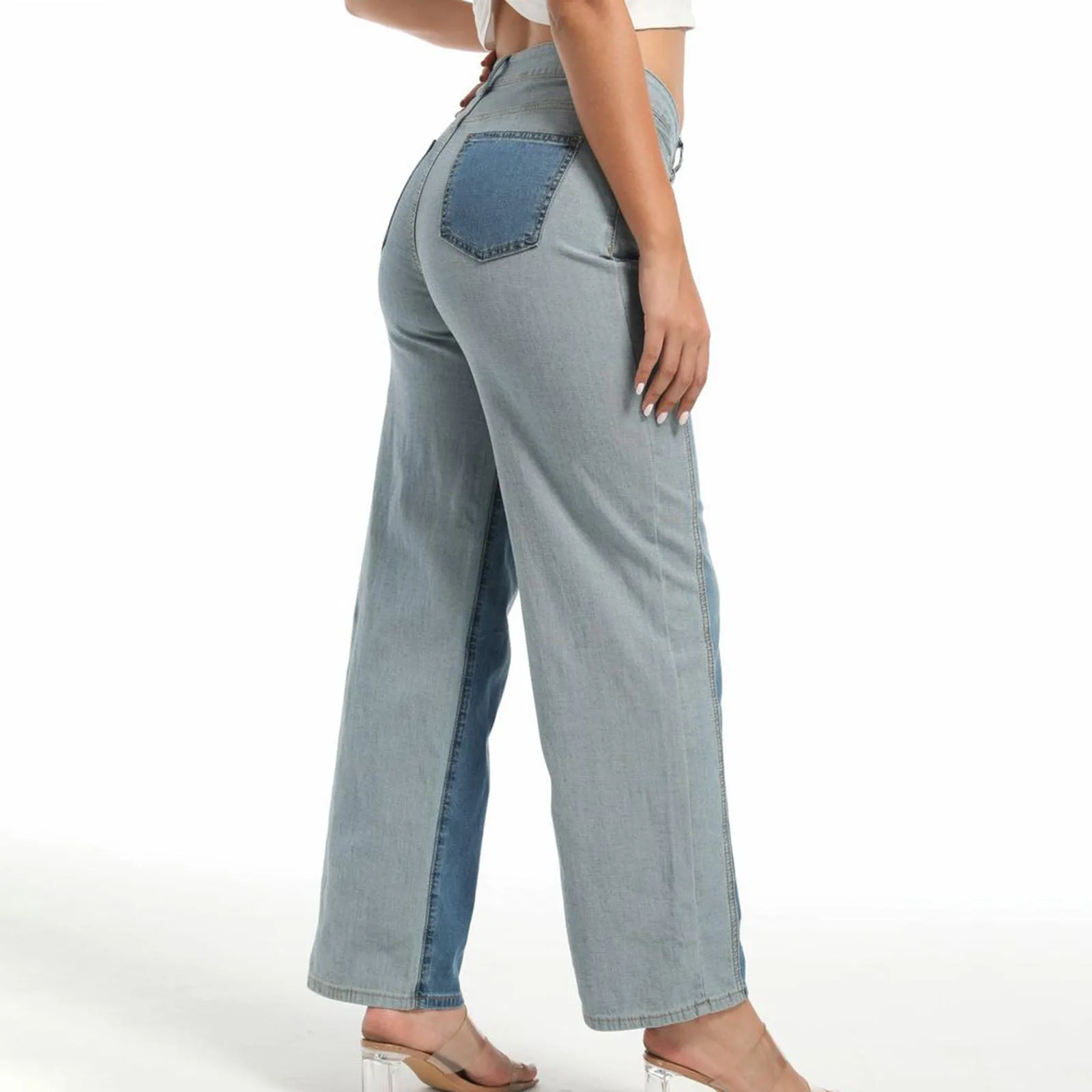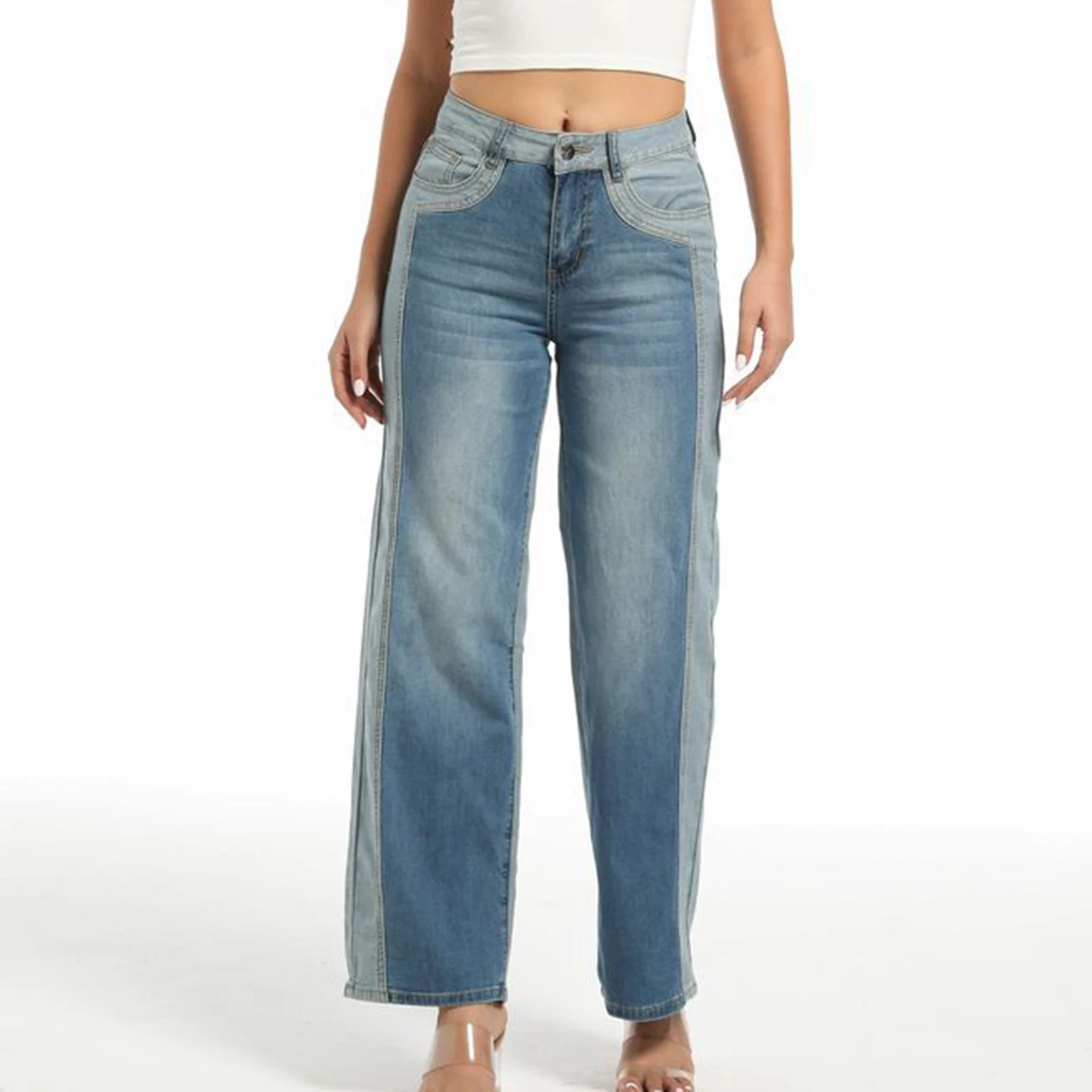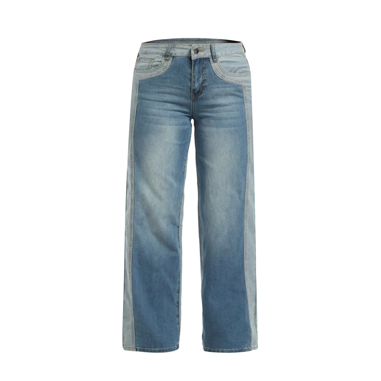 Feature:High rise.zip fly and button closure.five pockets.wide leg. straight leg.patchwork.contrast color.color block.relaxed fit